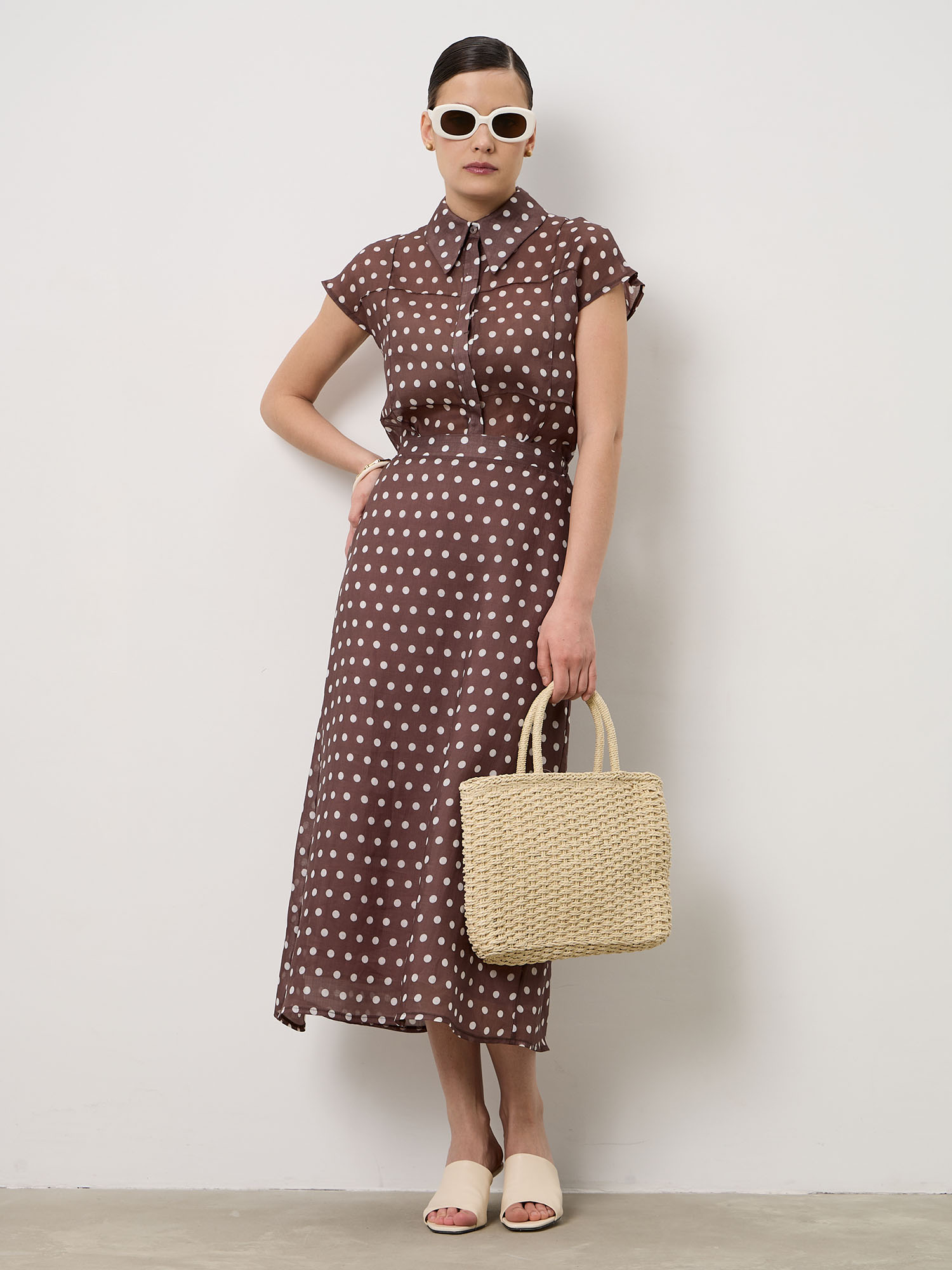 Коричневый фон с контрастным светлым горошком — благородное и выразительное сочетание, которое легко комбинируется с бежевыми, кремовыми и нейтральными оттенками гардероба.