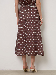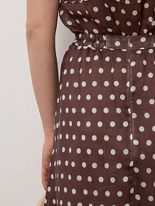 Юбка выполнена в длине миди с мягким расклёшенным силуэтом, который красиво движется при ходьбе. Классический принт в горошек придаёт модели выразительность и делает её стильным акцентом образа. Лаконичный дизайн подчёркивает натуральную фактуру ткани.