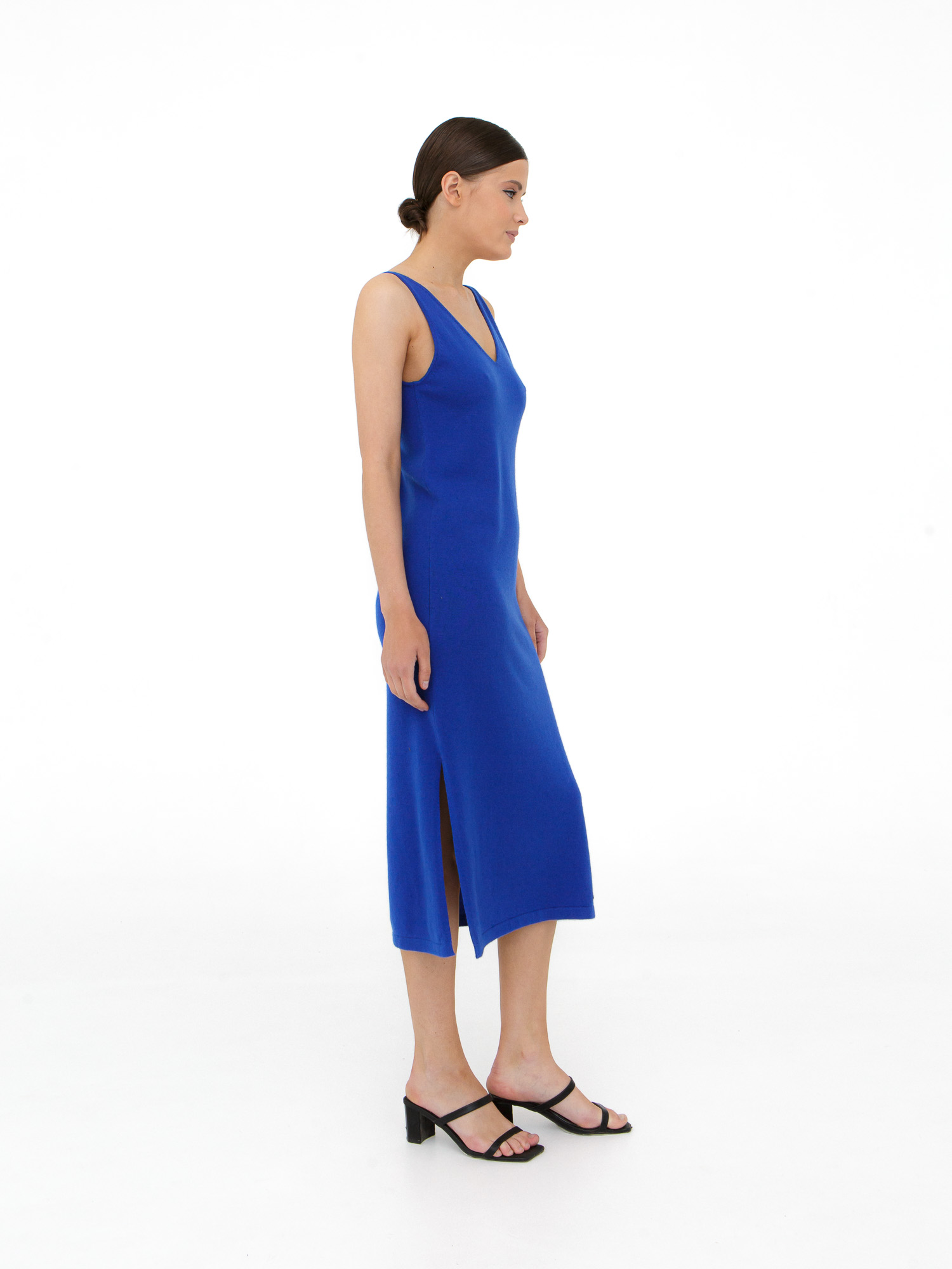 V-образный вырез, аккуратные бретели, боковой разрез для свободы движения. Минималистичный дизайн подчёркивает благородство материала.