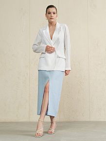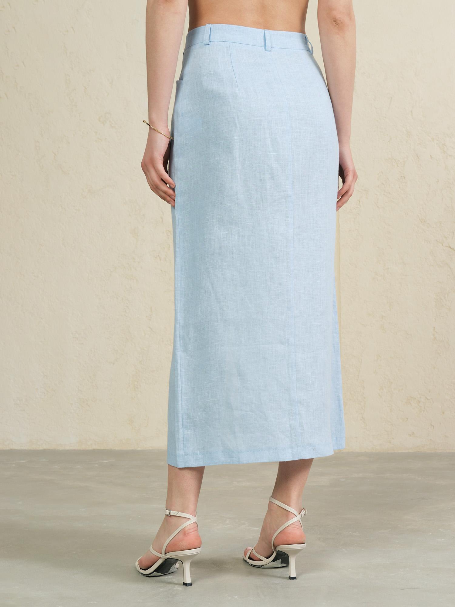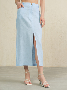 Льняная юбка просто супер! 100% натуральный лён дышит, летом в ней комфортно. Голубой цвет освежающий. Разрез спереди добавляет женственности.
